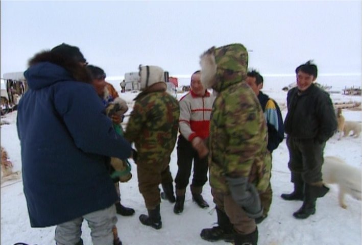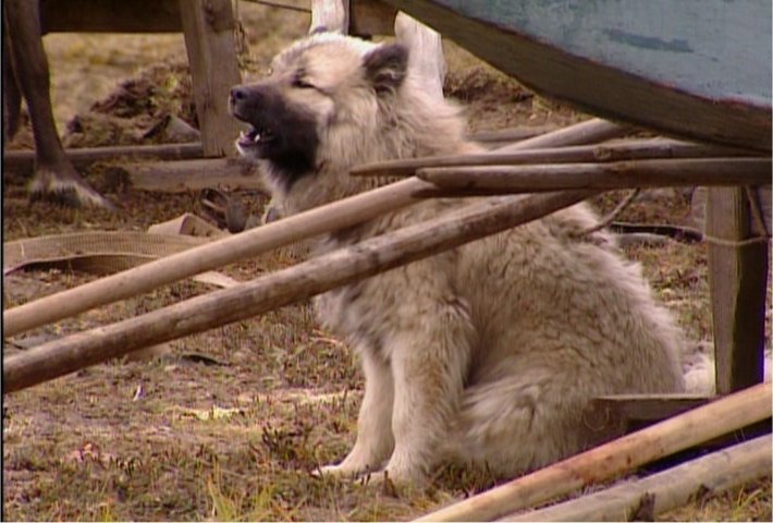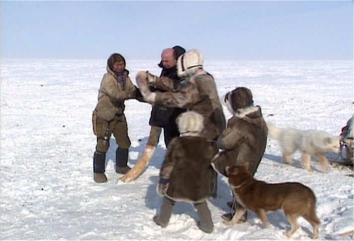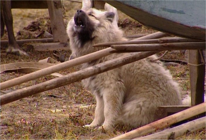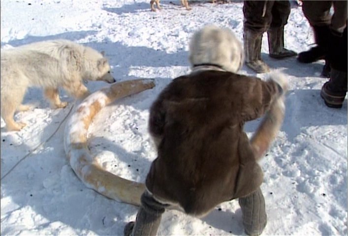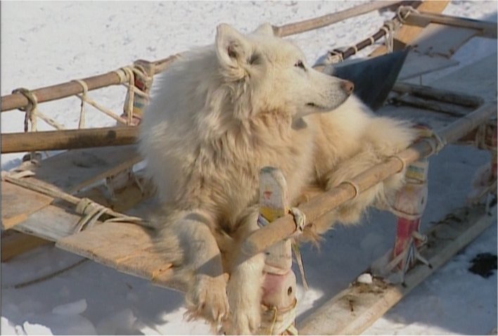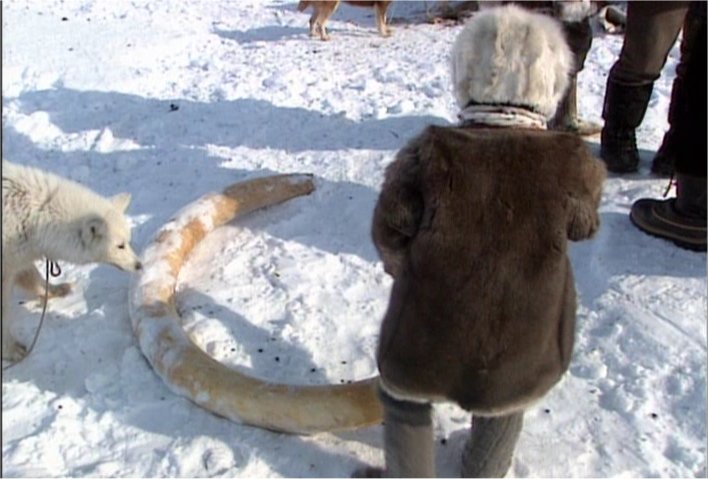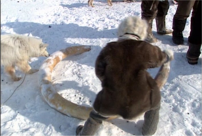 The Pictures below are from the Discovery Channel DVD "Raising the Mammoth" DVD- 10599. These Images have been captured from the DVD to illustrate the aboriginal dogs and are for non-profit purposes. Please buy the DVD if you wish to see the moving images. Some of the dogs on this page look like the modern Samoyed but it has yet to be determined just how close they are genetically. Readers are encouraged to read this article on the OLENEGONKA for further discussion. [Work In progress] |